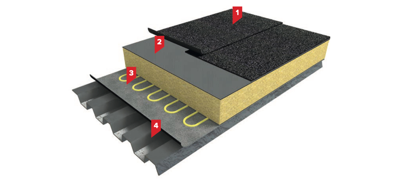 ELMO-Flex 4K is an elastomer polymer bitumen torch-on membrane with a compound reinforcement. It consists of a combination of synthetic, rubber and bitumen with modifying and stabilising additives to ensure a high resilience together with a good recovery after deformation.
